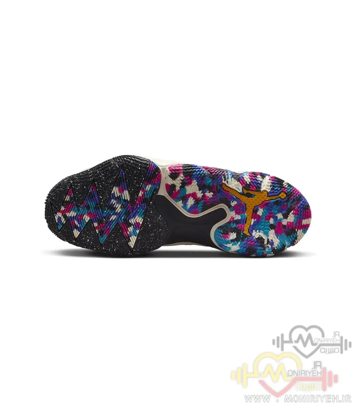 زیره کفش با الگوی چندجهته طراحی شده تا چسبندگی فوقالعادهای روی کف سالنهای بسکتبال ایجاد کند.