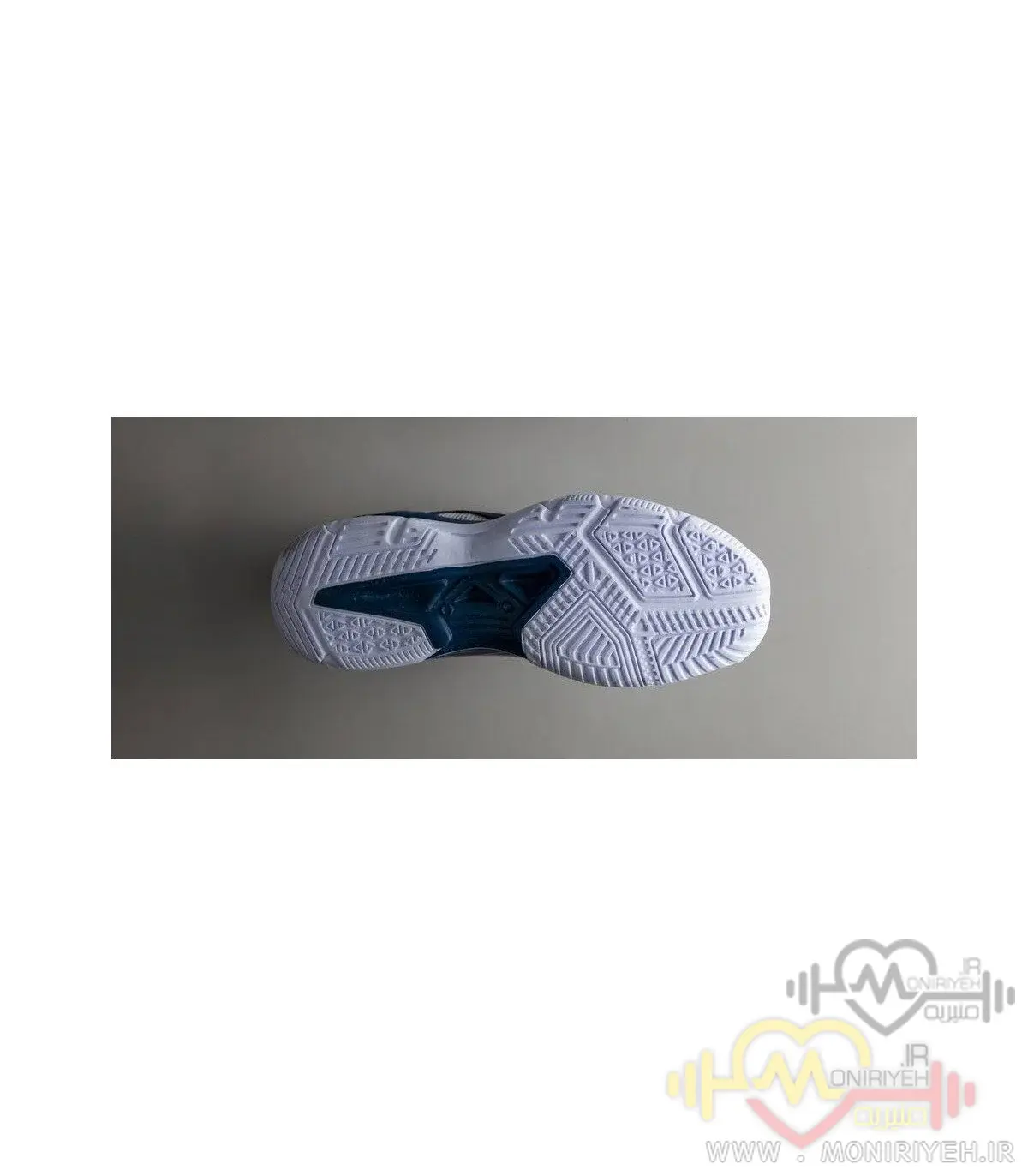 زیره کفش از جنس لاستیک مقاوم طراحی شده که چسبندگی خوبی روی کف سالنهای ورزشی ایجاد میکند.