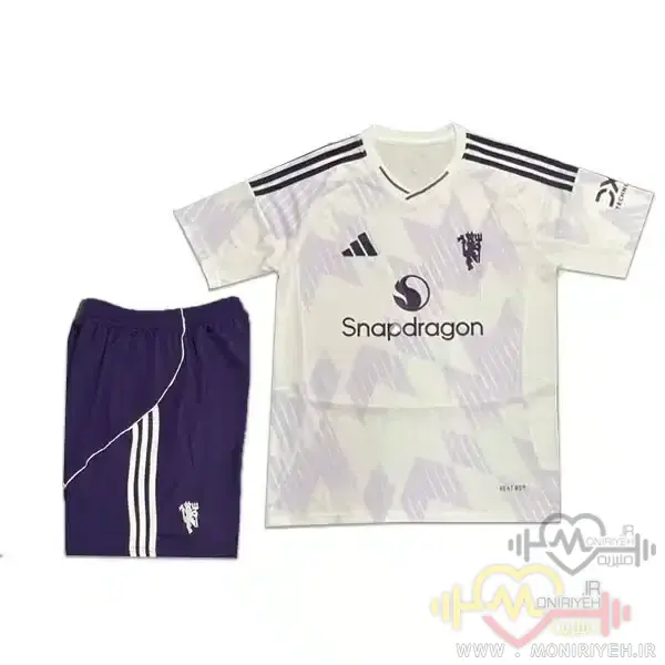 کیت دوم منچستر یونایتد 2025 (Away) – پیراهن و شورت سفید و بنفش